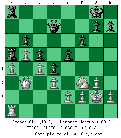Last move : 0-1 2007 July 10 20:35:46 [Event "FICGS__CHESS__CLASS_C__000042"] [Site "FICGS"] [Date "2007.05.06"] [Round "1"] [White "Dadban,Ali"] [Black "Miranda,Marcus"] [Result "0-1"] [WhiteElo "1816"] [BlackElo "1691"] 1.Nf3 Nf6 2.c4 e6 3.Nc3 Bb4 4.Qc2 O-O 5.a3 Bxc3 6.Qxc3 b6 7.g3 Bb7 8.Bg2 d5 9.d3 d4 10.Qd2 Nbd7 11.O-O Nc5 12.Qc2 a5 13.b3 a4 14.b4 Nb3 15.Rb1 Re8 16.Nd2 Bxg2 17.Kxg2 Nxc1 18.Rfxc1 e5 19.b5 Nd7 20.Rb4 Nc5 21.Ne4 Nb3 22.Rxb3 axb3 23.Qxb3 Qd7 24.a4 c5 25.Nd2 Ra5 26.Ra1 Rea8 27.Nf3 f6 0-1 Reti Opening Kingside Castling by player Black (move 4) Kingside Castling by player White (move 11) Player Black won this chess game. Follow this game move after move (download)If a ruler does not understand Chess, how can he rule over a kingdom ? (King Khusros II) Ohne Leiden bildet sich kein Charakter. (Ernst Freiherr von Feuchtersleben) Yo siempre he tenido un ligero sentimiento de lástima por una persona que no tiene conocimiento del Ajedrez. (Siegbert Tarrasch) D'abord les bases : Jouez et étudiez, puis étudiez et jouez, ensuite jouez et étudiez, puis étudiez et jouez. Deuxièmement : Donnez toujours le meilleur de vous-même ! (Ken Smith) Vladimir Ras-Putin is still alive... He is also a good actor, I saw him in the Lord of the Rings. (Rodolfo d'Ettorre)