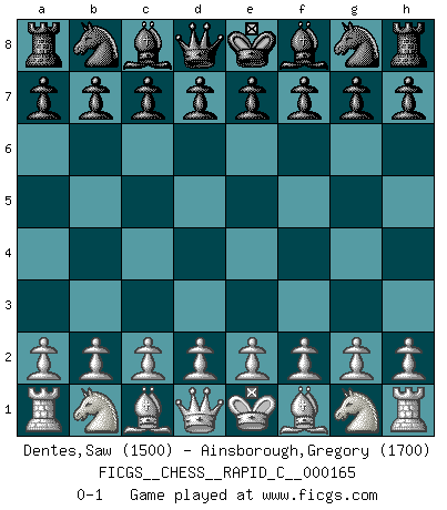 Last move : 0-1 2018 June 3 12:52:57 [Event "FICGS__CHESS__RAPID_C__000165"] [Site "FICGS"] [Date "2018.05.04"] [Round "1"] [White "Dentes,Saw"] [Black "Ainsborough,Gregory"] [Result "0-1"] [WhiteElo "1500"] [BlackElo "1700"] 0-1 This chess game has been lost on time (started : 2018.05.04 5:54:19) Player Black won this chess game. Follow this game move after move (download)First-class players lose to second class players because second-class players sometimes play a first-class game. (Tarrasch) Garry Kasparov war erst in der Großmeister-Organisation GMA, dann in der Profischach-Vereinigung PCA, zum Schluss kehrte er wieder in den Schoß der FIDE zurück. Aber gut, manche Leute sind flexibel (Viswanathan Anand) El Ajedrez es un terrible juego. Si no controlas el centro, tu oponente tiene una posición mas holgada. Si tienes control del centro, ¡entonces realmente tu tienes algo de que preocuparte!. (Siegbert Tarrasch) RxDa4 pat (...) Difficult things take a long time, impossible things a little longer. (Author unknown)