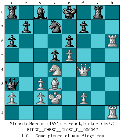 Last move : 1-0 2007 June 1 16:31:21 [Event "FICGS__CHESS__CLASS_C__000042"] [Site "FICGS"] [Date "2007.05.06"] [Round "1"] [White "Miranda,Marcus"] [Black "Faust,Dieter"] [Result "1-0"] [WhiteElo "1691"] [BlackElo "1627"] 1.e4 e6 2.d4 d5 3.Nc3 Nf6 4.Bg5 Bb4 5.e5 h6 6.Bd2 Bxc3 7.bxc3 Ne4 8.Qg4 g6 9.Bd3 Nxd2 10.Kxd2 c5 11.Nf3 Qa5 12.Rhb1 cxd4 13.Nxd4 Nd7 14.Qf4 g5 15.Qe3 a6 16.h4 gxh4 17.Rh1 Rg8 18.Rxh4 Rxg2 19.Rxh6 Rg8 20.Qf4 Qa3 21.Rah1 1-0 French : MacCutcheon, Lasker variation Player White won this chess game. Follow this game move after move (download)An attack on the wing should be met by play in the center. (Nimzovitch) Frage: Wie viele Autos haben Sie schon zerstört? - Antwort: Nur zwei. (Loek van Wely) El Rey es una pieza de pelea. ¡Usenlo!. (Wilhelm Steinitz) Un journaliste : 'Vous préférez avoir une dame de plus sur l'échiquier ou au lit ?' Boris Spassky : 'Ca dépend de la position.' Somehow our devils are never quite what we expect when we meet them face to face. (Nelson DeMille)