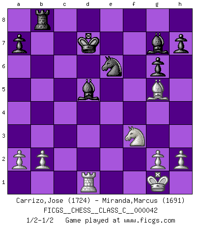Last move : 1/2-1/2 2007 August 5 18:23:22 [Event "FICGS__CHESS__CLASS_C__000042"] [Site "FICGS"] [Date "2007.05.06"] [Round "1"] [White "Carrizo,Jose"] [Black "Miranda,Marcus"] [Result "1/2-1/2"] [WhiteElo "1724"] [BlackElo "1691"] 1.e4 c5 2.Nc3 Nc6 3.f4 g6 4.Nf3 Bg7 5.Bc4 e6 6.f5 Nge7 7.fxe6 fxe6 8.d3 d5 9.Bb3 b5 10.O-O c4 11.exd5 exd5 12.dxc4 dxc4 13.Qxd8+ Nxd8 14.Nxb5 cxb3 15.Nc7+ Kd7 16.Nxa8 bxc2 17.Rf2 Nd5 18.Rxc2 Ne6 19.Bg5 Bb7 20.Rd1 Bxa8 21.Rcd2 Rb8 22.Rxd5+ Bxd5 1/2-1/2 Sicilian : Grand Prix attack, Schofman variation Kingside Castling by player White (move 10) This chess game ended in a draw. Follow this game move after move (download)Fischer is completely natural. He plays no roles. He's like a child. Very, very simple. (Zita Rajcsanyi) Schach ist eine Sache der genauen Beurteilung, wann man zuschlagen und wann man sich ducken muss. (Robert James Fischer) ¿Esta Bobby Fischer algo cuerdo?. (Salo Flohr) Les échecs, c'est la lutte contre l'erreur. (Johannes Zukertort) The Movers & Shakers of this world are those who play chess in the mornings and go to the disco in the evenings. (Dinesh De Silva)