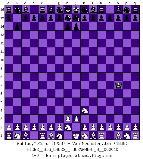 Last move : 1-0 2018 May 7 12:11:26 [Event "FICGS__BIG_CHESS__TOURNAMENT_B__000010"] [Site "FICGS"] [Date "2018.05.05"] [Round "1"] [White "Aahlad,Yeturu"] [Black "Van Mechelen,Jan"] [Result "1-0"] [WhiteElo "1723"] [BlackElo "1838"] 1.j2-k4 b15-b14 2.h1-o7 1-0 Follow this game move after move (download)In Fischer's hands, a slight theoretical advantage is as good a being a Queen ahead. (Isaac Kashdan) Kasparov stellt für gewöhnlich die Regeln auf und bricht sie dann selbst wieder. (Alexej Shirov) Después de la respuesta de las negras a 1.e4 con 1..e5, se quedan siempre tratando de entrar dentro del juego. (Howard Staunton) Il vaut toujours mieux jouer un plan faux de façon logique que de n'avoir pas de plan du tout. (Victor Kortchnoï) If I had no sense of humor, I would long ago have committed suicide. (Mahatma Gandhi)