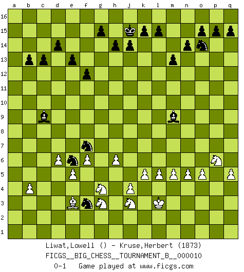 Last move : 0-1 2018 May 13 2:10:17 [Event "FICGS__BIG_CHESS__TOURNAMENT_B__000010"] [Site "FICGS"] [Date "2018.05.05"] [Round "1"] [White "Liwat,Lowell"] [Black "Kruse,Herbert"] [Result "0-1"] [WhiteElo ""] [BlackElo "1873"] 1.g2-g4 j15-k13 2.d2-d4 h16-o10 3.e2-e4 o10-f2 4.h3-h4 f2-e1 5.b1-c3 e1-f2 6.g1-f3 f2-c2 7.f1-e2 m15-m13 8.f3-e1 c2-e2 9.c3-e2 l16-o13 10.m2-m4 n15-n14 11.b2-b3 e15-e13 12.c1-b2 f16-c13 13.d4-d5 p16-o14 14.l2-l4 d15-d14 15.e1-c2 c16-k9 16.e2-g3 o16-d6 17.c2-e3 b16-c14 18.e4-e5 d6-g9 19.n2-n3 e16-e14 20.a1-f1 h15-g13 21.d5-d6 k16-h15 22.k2-k4 m16-m14 23.m4-m5 m14-l14 24.h2-k3 a15-a13 25.l4-l5 a13-a12 26.n3-n4 a12-a11 27.l1-n3 a16-a12 28.h1-c6 l14-l12 29.o1-b13 a12-f12 30.b13-c14 b15-c14 31.g3-f5 e14-f14 32.j2-g3 f12-c12 33.c6-b6 c12-b12 34.b6-g11 f14-f11 35.g11-p3 l12-p12 36.p3-j9 f11-j11 37.j9-f6 b12-f12 38.f6-e6 p12-p2 39.p1-n2 f12-q12 40.q2-q4 j11-q11 41.n2-o4 p2-p12 42.q4-q5 p12-e12 43.e6-b9 e12-b12 44.b9-a8 b12-n12 45.k1-m2 q11-q8 46.a8-c10 n12-c12 47.c10-b11 c13-b14 48.b11-a11 c12-a12 49.a11-c11 a12-a2 50.e3-c4 g16-e15 51.f1-a1 a2-a1 52.b2-a1 q8-a8 53.j1-k2 q12-q11 54.c11-c6 q11-a11 55.a1-b2 k9-h11 56.c6-b7 a8-a7 57.b7-b4 j16-j15 58.m1-a1 q16-a16 59.a1-a7 a11-a7 60.k2-l3 a16-a13 61.f5-d4 h11-e8 62.h4-h5 g9-h8 63.k3-h4 a7-a2 64.d4-c2 o13-c2 65.q1-c1 a13-b13 66.b4-b13 c14-b13 67.c1-c2 e8-f7 68.h4-f3 f7-d5 69.c2-f2 b14-e11 70.f3-d2 f15-f13 71.m2-l4 f13-f12 72.b2-d4 e15-f13 73.d2-e4 a2-f2 74.e4-f2 c15-c13 75.g3-f5 d5-k11 76.f2-e4 h8-l11 77.n4-n5 l11-q6 78.o4-p6 q6-n3 79.l4-n3 g13-h11 80.o2-o4 h15-j13 81.o4-o5 k13-j11 82.e4-c5 j11-h9 83.c4-e3 h11-g9 84.b3-b4 f13-g11 85.c5-e4 j13-h11 86.j3-j4 g11-f9 87.e4-c5 f9-g7 88.h5-h6 g7-f5 89.g4-f5 g9-h7 90.c5-e4 e11-c9 91.f5-f6 h9-f8 92.e3-g4 f8-e6 93.d4-e3 h11-g9 94.n3-l4 g9-f7 95.k4-k5 h7-g5 96.e4-g3 k11-m9 97.l4-j3 g5-f3 0-1 Follow this game move after move (download)By this measure (on the gap between Fischer & his contemporaries), I consider him the greatest world champion. (Garry Kasparov) Wir können eben der zündenden Macht des Opfers nicht wiederstehen, denn die Begeisterung für das Opfer liegt in der Natur des Menschen. (Rudolf Spielmann) Realmente no sabemos como el juego fue inventado, aunque hay sospechas. Tan pronto como descubramos a los culpables, se los haremos saber. (Bruce Pandolfini) Toute estimation doit être constamment réévaluée. (Jacob Estrin) Somehow our devils are never quite what we expect when we meet them face to face. (Nelson DeMille)