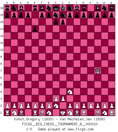 Last move : 1-0 2018 May 7 12:11:41 [Event "FICGS__BIG_CHESS__TOURNAMENT_B__000010"] [Site "FICGS"] [Date "2018.05.05"] [Round "1"] [White "Kohut,Gregory"] [Black "Van Mechelen,Jan"] [Result "1-0"] [WhiteElo "1833"] [BlackElo "1838"] 1.j2-k4 e15-e13 2.h1-o7 1-0 Follow this game move after move (download)All I want to do, ever, is just play Chess. (Bobby Fischer) Capablanka war das größte Genie der Schachgeschichte! Aber denken sie nicht er habe nichts vom Schach verstanden. Er wusste nur soviel wie er wissen musste um seine Ziele zu erreichen. (Mikhail Moiseyevich Botvinik) Del Ajedrez se ha dicho que la vida no es lo suficientemente larga para él, pero eso es culpa de la vida, no del Ajedrez. (William Ewart Napier) Aucun coup ne doit être joué sans but. (Pedro Damiano) However beautiful the strategy, you should occasionally look at the results. (Winston Churchill)