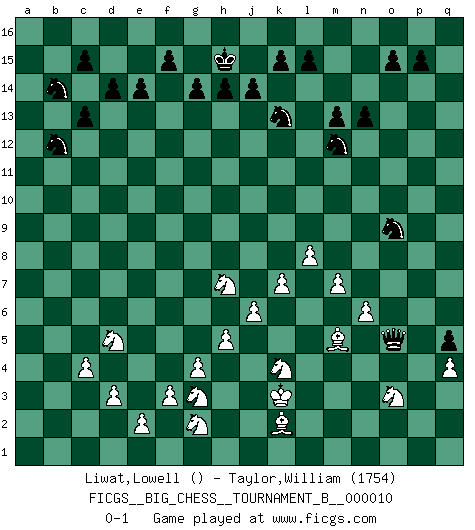 Last move : 0-1 2018 September 12 16:59:51 [Event "FICGS__BIG_CHESS__TOURNAMENT_B__000010"] [Site "FICGS"] [Date "2018.05.05"] [Round "1"] [White "Liwat,Lowell"] [Black "Taylor,William"] [Result "0-1"] [WhiteElo ""] [BlackElo "1754"] 1.g2-g4 b16-c14 2.h1-a8 d15-d14 3.m2-m4 j15-k13 4.p2-p3 h16-o10 5.j2-g3 m15-m13 6.o2-o4 p16-o14 7.n2-n4 l16-p12 8.g1-j2 k16-l14 9.l2-l4 n15-n13 10.b2-b3 o16-l13 11.b1-c3 g15-g14 12.o1-p2 c16-f13 13.a8-b7 a16-b16 14.n4-n5 f16-g15 15.h3-h4 q15-q13 16.k1-l3 g15-d12 17.l4-l5 q13-q12 18.c1-b2 q12-q11 19.k2-k4 q11-q10 20.f1-j4 q10-q9 21.b7-d9 q16-q10 22.p2-c14 b15-c14 23.d9-d12 c14-c13 24.d12-a12 o10-b10 25.c3-e4 b16-b12 26.a12-a4 h15-g13 27.b2-f6 b10-b9 28.p1-n2 j16-h15 29.f2-f3 q9-q8 30.h4-h5 q8-q7 31.m4-m5 q10-a10 32.a4-d4 b12-d12 33.d4-b2 m16-q16 34.a2-a4 g16-f14 35.k4-k5 q7-q6 36.a1-b1 e16-b16 37.j2-k4 q6-q5 38.q2-q3 l13-m12 39.d2-d3 d12-f12 40.f6-m12 f12-m12 41.j4-h3 b9-b8 42.g3-f5 a10-a4 43.b2-m12 l14-m12 44.b3-a4 b8-a7 45.b1-b16 q16-b16 46.l1-k2 a7-a4 47.c2-c4 b16-b2 48.f5-g3 f14-d13 49.j1-j2 a4-f9 50.e1-b1 b2-c2 51.b1-b15 c2-a2 52.n5-n6 f13-c16 53.b15-b16 d13-b14 54.m1-a1 f9-a14 55.a1-a2 a14-a2 56.j3-j4 g13-e14 57.e4-c3 a2-a5 58.g3-e4 e14-f16 59.q1-b1 f16-d15 60.b16-c16 b14-c16 61.c3-d5 d15-b14 62.h2-f1 a5-f10 63.k5-k6 f10-l10 64.l5-l6 l10-p6 65.j2-k3 p6-o5 66.q3-q4 a15-a13 67.h3-k1 o5-o10 68.j4-j5 a13-a12 69.l3-n4 p12-m9 70.n4-p5 o10-l10 71.n2-m4 m9-p6 72.o4-o5 p6-m9 73.m5-m6 o14-n12 74.m6-m7 l10-h10 75.l6-l7 h10-g10 76.l7-l8 m9-k11 77.k1-n4 k11-h9 78.m4-l6 e15-e14 79.b1-b10 g10-f11 80.j5-j6 c16-e15 81.k6-k7 e15-d13 82.f1-e3 d13-b12 83.l6-k8 h9-g10 84.k8-h7 a12-a11 85.b10-g10 f11-g10 86.k2-a11 g10-g11 87.a11-k2 g11-p3 88.p5-o3 p3-o4 89.n4-m5 o4-o5 90.e4-g3 n12-m10 91.e3-g2 m10-o9 0-1 Follow this game move after move (download)A strong memory, concentration, imagination, and a strong will is required to become a great Chess player. (Bobby Fischer) Den Ruhm habe ich schon, jetzt brauche ich noch das Geld. (Wilhelm Steinitz) El Ajedrez es realmente noventa y nueve por ciento calculación. (Soltis) On peut tirer plus d'utilité d'une partie perdue que de 100 parties gagnées. (Capablanca) If only faces could talk... (Pat Summerall, Sportscaster during the Super Bowl)