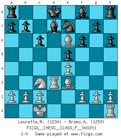 Last move : 1-0 2018 May 9 16:7:42 [Event "FICGS__CHESS__CLASS_F__000201"] [Site "FICGS"] [Date "2018.05.08"] [Round "1"] [White "Leurette,Marc-Antoine"] [Black "Bromo,Alexis"] [Result "1-0"] [WhiteElo "1234"] [BlackElo "1259"] 1.e4 e5 2.Nf3 Nc6 3.Bc4 h6 4.d4 d6 5.dxe5 Nxe5 6.Nxe5 dxe5 7.Qxd8+ Kxd8 8.Nc3 f6 9.Be3 Ne7 10.O-O-O Bd7 11.Rd3 c6 12.Be6 1-0 King's pawn game Queenside Castling by player White (move 10) Player White won this chess game. Follow this game move after move (download)When your house is on fire, you can't be bothered with the neighbors. Or, as we say in Chess, if your King is under attack you don't worry about losing a Pawn on the Queen's side. (Gary Kasparov) Fischer ist das größte Genie, das je vom Schachhimmel heruntergestiegen ist. (Mikhail Nekhemyevich Tal) El pensamiento metódico es mas útil en el Ajedrez que la inspiración. (C. J. S. Purdy) Je crois qu'il existe des manières très spécifiques de jouer efficacement contre une machine. Evidemment, nous n'avons aucune chance en technique pure, parce que l'ordinateur calcule de manière parfaite. Mais lorsque nous faisons appel à notre cerveau, en utilisant l'intuition et la compréhension, alors nous restons beaucoup plus forts. (Anatoli Karpov) Inventor: A person who makes an ingenious arrangement of wheels, levers and springs, and believes it civilization. (Ambrose Bierce, The Devil's Dictionary)