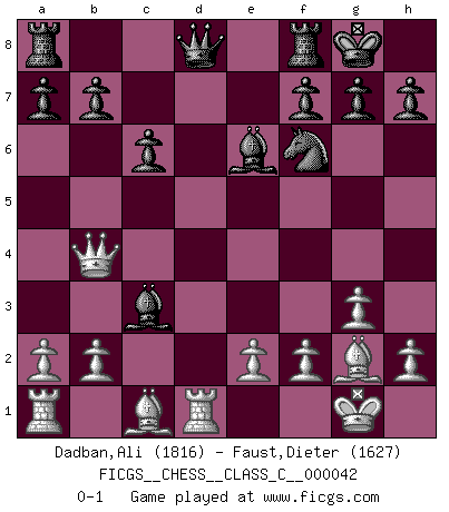 Last move : 0-1 2007 June 13 19:17:48 [Event "FICGS__CHESS__CLASS_C__000042"] [Site "FICGS"] [Date "2007.05.06"] [Round "1"] [White "Dadban,Ali"] [Black "Faust,Dieter"] [Result "0-1"] [WhiteElo "1816"] [BlackElo "1627"] 1.Nf3 Nf6 2.c4 e6 3.g3 d5 4.Bg2 dxc4 5.Qc2 Nbd7 6.Qxc4 c6 7.O-O Bd6 8.Nc3 O-O 9.d4 e5 10.dxe5 Nxe5 11.Nxe5 Bxe5 12.Rd1 Be6 13.Qb4 Bxc3 0-1 Reti Opening Kingside Castling by player White (move 7) Kingside Castling by player Black (move 8) Player Black won this chess game. Follow this game move after move (download)Why must I lose to this idiot ? (Aron Nimzovich) Mutter, ich bin eben Ex-Weltmeister geworden. --beim nach Hause Kommen nach dem Verlust des WM-Titels an Mihail Botvinnik -- (Mikhail Nekhemyevich Tal) Hay dos clases de hombres: aquellos que se conforman en dejarse llevar por las circunstancias y que juegan barajas y aquellos decididos a controlar las circunstancias y que juegan al Ajedrez. (Mortimer Collins) Il (Jacob Murray) ne joue pas pour le bon coup, mais pour le meilleur. (Eloi Relange) A bird doesn't sing because it has an answer, it sings because it has a song. (Maya Angelou)