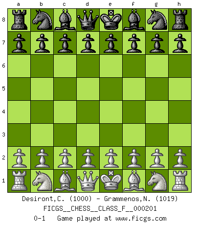 Last move : 0-1 2018 June 17 15:9:37 [Event "FICGS__CHESS__CLASS_F__000201"] [Site "FICGS"] [Date "2018.05.08"] [Round "1"] [White "Desiront,Christian"] [Black "Grammenos,Nikos"] [Result "0-1"] [WhiteElo "1000"] [BlackElo "1019"] 0-1 This chess game has been lost on time (started : 2018.05.08 14:43:44) Player Black won this chess game. Follow this game move after move (download)After a bad opening, there is hope for the middle game. After a bad middle game, there is hope for the endgame. But once you are in the endgame, the moment of truth has arrived. (Edmar Mednis) Die westlichen Werte sind eine Sprache, welche die Putin-Administration nicht versteht. (Garry Kasparov) El Ajedrez se juega con la mente... ¡no con las manos!. (Renaud y Kahn) On peut tirer plus d'utilité d'une partie perdue que de 100 parties gagnées. (Capablanca) In God we trust, all others we virus scan. (Anonymous)