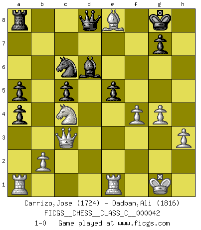Last move : 1-0 2007 August 16 23:4:40 [Event "FICGS__CHESS__CLASS_C__000042"] [Site "FICGS"] [Date "2007.05.06"] [Round "1"] [White "Carrizo,Jose"] [Black "Dadban,Ali"] [Result "1-0"] [WhiteElo "1724"] [BlackElo "1816"] 1.e4 e5 2.Nf3 Nc6 3.Bb5 a6 4.Ba4 Nf6 5.O-O Be7 6.Re1 b5 7.Bb3 d6 8.c3 O-O 9.d4 Bg4 10.Be3 exd4 11.cxd4 Na5 12.Bc2 c5 13.h3 Bh5 14.g4 Bg6 15.Nbd2 Nc6 16.d5 Nb4 17.Bb1 a5 18.a3 Na6 19.Nh2 Nd7 20.f4 f6 21.Nhf3 Re8 22.Qc2 Bf8 23.Nh4 c4 24.Nxg6 hxg6 25.a4 Nb4 26.Qc3 bxa4 27.Nxc4 Nc5 28.Bxc5 dxc5 29.d6 Nc6 30.e5 fxe5 31.Bxg6 Bxd6 32.Bxe8 1-0 Ruy Lopez : Closed Kingside Castling by player White (move 5) Kingside Castling by player Black (move 8) Player White won this chess game. Follow this game move after move (download)You have to have the fighting spirit. You have to force moves and take chances. (Bobby Fischer) Die unerbitterlichsten Regeln im Schach sind die Ausnahmen. (Savielly Grigorievitsch Tartakower) No nos podemos resistir a la fascinación de un sacrificio ya que la pasión por los sacrificios es parte de la naturaleza de un jugador de Ajedrez. (Rudolf Spielman) Si rien de grave n'est détecté lors de l'analyse d'une position, on joue alors le coup. Seconde règle de Blumenfeld. There are three kinds of lies: lies, damned lies and statistics. (Mark Twain)