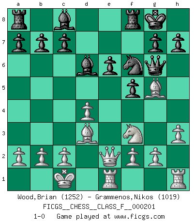 Last move : 1-0 2018 August 8 9:52:43 [Event "FICGS__CHESS__CLASS_F__000201"] [Site "FICGS"] [Date "2018.05.08"] [Round "1"] [White "Wood,Brian"] [Black "Grammenos,Nikos"] [Result "1-0"] [WhiteElo "1252"] [BlackElo "1019"] 1.e4 e6 2.Nf3 d5 3.Nc3 dxe4 4.Nxe4 Nf6 5.Nxf6+ Qxf6 6.d4 Bd6 7.Bg5 Qg6 8.Bd3 f5 9.Qe2 O-O 10.O-O-O Nd7 11.Rde1 Nf6 12.h3 1-0 French defense Kingside Castling by player Black (move 9) Queenside Castling by player White (move 10) Player White won this chess game. Follow this game move after move (download)Chess is as much a mystery as women. (Purdy) Über Kasparov: Es ist offensichtlich, daß er in einem totalitären Staat aufwuchs und deshalb zu diktatorischen Zügen neigt. (Viktor Kortschnoi) ¿Porque tengo que perder ante este idiota?. (Aron Nimzovich) Le pion, dans sa simplicité, marche droit devant lui, mais lorsqu'il prend, il le fait obliquement? Ainsi l'homme, tant qu'il reste pauvre, marche dans la droiture et vit honnêtement, mais lorsqu'il recherche les honneurs, il flatte, se parjure et, par les voies obliques, cherche une position supérieure sur l'échiquier du monde. (Jean de Galles) Creativity is allowing yourself to make mistakes. Art is knowing which ones to keep. (Scott Adams)