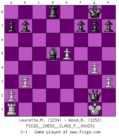 Last move : 0-1 2018 May 28 22:34:10 [Event "FICGS__CHESS__CLASS_F__000201"] [Site "FICGS"] [Date "2018.05.08"] [Round "1"] [White "Leurette,Marc-Antoine"] [Black "Wood,Brian"] [Result "0-1"] [WhiteElo "1234"] [BlackElo "1252"] 1.e4 c5 2.d4 cxd4 3.c3 dxc3 4.Nxc3 e6 5.Nf3 Nc6 6.Bd3 d5 7.O-O d4 8.Nb5 e5 9.Bc2 Nf6 10.Nbxd4 Nxd4 11.Nxd4 exd4 12.Bg5 Be7 13.Bd3 O-O 14.e5 Ng4 15.Bxe7 Qxe7 16.Re1 Qh4 17.h3 Nxf2 18.Qe2 Nxd3 19.Qxd3 Be6 20.Re4 Qg5 21.g4 Rfd8 22.Rxd4 Rxd4 23.Qxd4 Rd8 24.Qe4 Bd5 25.Qe1 Qf4 26.b3 Qf3 27.Qf1 Qg3+ 28.Qg2 Qxg2+ 0-1 Sicilian : Smith-Morra gambit Kingside Castling by player White (move 7) Kingside Castling by player Black (move 13) Player Black won this chess game. Follow this game move after move (download)Strategy requires thought, tactics require observation. (Max Euwe) Ich suche im Schach immer etwas Eigenes. Riskantes Spiel im Stile schachlicher Musketiere ist nicht meine Sache, auch wenn es vielen Freunden scharfer Wendungen gefällt. (Anatoly Karpov) Yo nunca en mi vida he jugado la Defensa Francesa, que viene siendo la más aburrida de todas las Aperturas. (Wilhelm Steinitz) Donnez-moi un Cavalier en 6e et je gagnerais toutes mes parties. (Steinitz) Nobody is always a winner, and anybody who says he is, is either a liar or doesn't play poker. (Amarillo Slim)