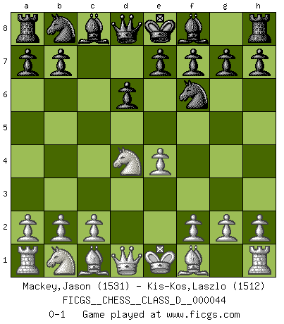 Last move : 0-1 2007 June 18 14:3:11 [Event "FICGS__CHESS__CLASS_D__000044"] [Site "FICGS"] [Date "2007.05.07"] [Round "1"] [White "Mackey,Jason"] [Black "Kis-Kos,Laszlo"] [Result "0-1"] [WhiteElo "1531"] [BlackElo "1512"] 1.e4 c5 2.Nf3 d6 3.d4 cxd4 4.Nxd4 Nf6 0-1 This chess game has been lost on time (started : 2007.05.07 17:3:9) Sicilian Player Black won this chess game. Follow this game move after move (download)When I asked Fischer why he had not played a certain move in our game, he replied: 'Well, you laughed when I wrote it down !' (Mikhail Tal) Korrekt heißt in Deutschland die Haltung eines Mannes, dessen Benehmen nach dem Urteile seiner Nachbarn seiner Stellung angemessen ist. Um korrekt zu sein, muß man sich der Meinung der anderen anpassen... (Emanuel Lasker) Con o sin el título, Bobby Fischer fue sin lugar a dudas el mas grande jugador de su época. (Burt Hochberg) A chaque perte on perd un peu de soi. (Joël Lautier) Computers have lots of memory but no imagination. (Anonymous)