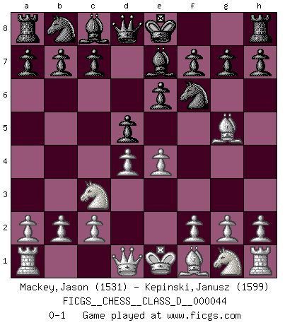 Last move : 0-1 2007 June 20 14:11:40 [Event "FICGS__CHESS__CLASS_D__000044"] [Site "FICGS"] [Date "2007.05.07"] [Round "1"] [White "Mackey,Jason"] [Black "Kepinski,Janusz"] [Result "0-1"] [WhiteElo "1531"] [BlackElo "1599"] 1.e4 e6 2.d4 d5 3.Nc3 Nf6 4.Bg5 Be7 0-1 This chess game has been lost on time (started : 2007.05.07 17:3:9) French : Classical Player Black won this chess game. Follow this game move after move (download)Combinations have always been the most intriguing aspect of Chess. The masters look for them, the public applauds them, the critics praise them. It is because combinations are possible that Chess is more than a lifeless mathematical exercise. They are the poetry of the game; they are to Chess what melody is to music. They represent the triumph of mind over matter. (Reuben Fine) Dein Körper muss in Topform sein. Dein Schach verfällt, wenn dein Körper verfällt. Der Körper kann nicht vom Geist getrennt werden. (Robert James Fischer) Botvinnik trató de alejar el misterio referente al Ajedrez, siempre relacionandolo a situaciones de la vida diaria. Solía llamar al Ajedrez un problema inexacto típico, similar a aquellos en que la gente tiene siempre que resolver a cada día. (Garry Kasparov) Soyez une menace à chaque fois que vous vous asseyez pour jouer. (Ken Smith) As a goal marker shodan is important. As a destination it is a poor place to stop. (Thomas Tamayo)