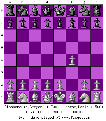 Last move : 1-0 2018 June 12 2:34:12 [Event "FICGS__CHESS__RAPID_C__000166"] [Site "FICGS"] [Date "2018.05.11"] [Round "1"] [White "Ainsborough,Gregory"] [Black "Hazar,Deniz"] [Result "1-0"] [WhiteElo "1700"] [BlackElo "1500"] 1.f4 1-0 This chess game has been lost on time (started : 2018.05.11 8:22:4) Bird's Opening Player White won this chess game. Follow this game move after move (download)White lost because he failed to remember the right continuation and had to think up the moves himself. (Siegbert Tarrasch) Nicht daß Diemer aus Opportunismus Mitglied der NSDAP geworden wäre. Er war ein Fanatiker, in allem, was er tat. (Hans Ree) El Ajedrez es un invernadero donde los frutos del carácter pueden madurar mas completamente que en la vida. (Edward Morgan Foster) Les échecs sont un jeu terrible. Si vous n'avez pas le centre, votre adversaire a une position plus libre. Par contre, si vous avez le centre, alors vous avez vraiment quelque chose pour laquelle vous inquiéter ! (Siegbert Tarrasch) Drag your thoughts away from your troubles... by the ears, by the heels, or any other way you can manage it. (Mark Twain)
