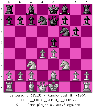 Last move : 0-1 2018 July 8 6:58:59 [Event "FICGS__CHESS__RAPID_C__000166"] [Site "FICGS"] [Date "2018.05.11"] [Round "1"] [White "Cafiero,Florian"] [Black "Ainsborough,Gregory"] [Result "0-1"] [WhiteElo "1519"] [BlackElo "1700"] 1.e4 Nf6 2.Nc3 d6 3.d4 Nbd7 4.f4 e5 5.Nf3 Qe7 6.Be2 g6 7.fxe5 dxe5 0-1 This chess game has been lost on time (started : 2018.05.11 8:22:4) Alekhine's defense Player Black won this chess game. Follow this game move after move (download)Chess mastery essentially consists of analyzing Chess positions accurately. (Mikhail Botvinnik) Ich habe die besten Aussichten, den ersten Preis zu gewinnen - denn jeder muss gegen Steinitz spielen, nur ich nicht! (Wilhelm Steinitz) Debemos de asegurarnos de que el Ajedrez no se convierta en un lenguaje muerto, muy interesante, pero solo para un grupo muy pequeño. (Sytze Faber) L'attaque fait le spectacle, la défense gagne les matchs. (Dicton footballistique) Nobody is always a winner, and anybody who says he is, is either a liar or doesn't play poker. (Amarillo Slim)