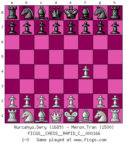 Last move : 1-0 2018 June 11 14:18:31 [Event "FICGS__CHESS__RAPID_C__000166"] [Site "FICGS"] [Date "2018.05.11"] [Round "1"] [White "Nurcahyo,Dery"] [Black "Meron,Tran"] [Result "1-0"] [WhiteElo "1689"] [BlackElo "1500"] 1.f4 1-0 This chess game has been lost on time (started : 2018.05.11 8:22:4) Bird's Opening Player White won this chess game. Follow this game move after move (download)The tactician knows what to do when there is something to do; whereas the strategian knows what to do when there is nothing to do. (Gerald Abrahams) Schach verlangt totale Konzentration. (Robert James Fischer) Siempre es mejor sacrificar los hombres de tu oponente. (Savielly Tartakower) Celui qui prend des risques peut perdre, celui qui n'en prend pas perd toujours. (Xavier Tartacover) Somewhere in the world there is an epigram for every dilemma. (Hendrik Willem van Loon)