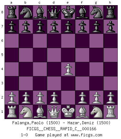 Last move : 1-0 2018 June 11 2:17:6 [Event "FICGS__CHESS__RAPID_C__000166"] [Site "FICGS"] [Date "2018.05.11"] [Round "1"] [White "Falanga,Paolo"] [Black "Hazar,Deniz"] [Result "1-0"] [WhiteElo "1500"] [BlackElo "1500"] 1.e4 1-0 This chess game has been lost on time (started : 2018.05.11 8:22:4) King's pawn Opening Player White won this chess game. Follow this game move after move (download)Some part of a mistake is always correct. (Savielly Tartakover) Nur ein wirklich starker Spieler weiß wie schwach er spielt. (Savielly Grigorievitsch Tartakower) Yo jugué Ajedrez con el y a veces le pude haber ganado solo que siempre devuelve su última jugada y juega la partida de manera diferente. (Mark Twain) C'est la seule position que je connaisse où les deux camps sont mals. Propos prêtés à V. Anand. A clear conscience is usually the sign of a bad memory. (Unknown)