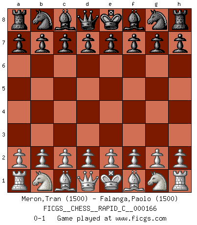 Last move : 0-1 2018 June 10 14:9:44 [Event "FICGS__CHESS__RAPID_C__000166"] [Site "FICGS"] [Date "2018.05.11"] [Round "1"] [White "Meron,Tran"] [Black "Falanga,Paolo"] [Result "0-1"] [WhiteElo "1500"] [BlackElo "1500"] 0-1 This chess game has been lost on time (started : 2018.05.11 8:22:4) Player Black won this chess game. Follow this game move after move (download)A big shock; the best chess player in history has passed away. (Lajos Portisch, about Bobby Fischer's death) Karpov ist ein Museumsstück. (Garry Kasparov) El tablero es el mundo, las piezas es el fenomeno del universo, las reglas del juego son lo que llamamos leyes de la naturaleza y el jugador del lado opuesto, se encuentra oculto a nuestra vista. (Thomas Huxley) J'ai toujours senti une vague pitié pour l'homme qui ne connaît rien aux échecs, tout comme j'en aurais pour un homme ignorant de l'amour. Les Echecs, comme la musique ou comme l'amour, ont le pouvoir de rendre heureux. (Siegbert Tarrasch) Chess, like love, like music, has the power to make people happy. (Siegbert Tarrasch)