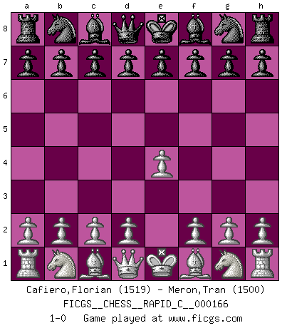 Last move : 1-0 2018 June 10 14:9:44 [Event "FICGS__CHESS__RAPID_C__000166"] [Site "FICGS"] [Date "2018.05.11"] [Round "1"] [White "Cafiero,Florian"] [Black "Meron,Tran"] [Result "1-0"] [WhiteElo "1519"] [BlackElo "1500"] 1.e4 1-0 This chess game has been lost on time (started : 2018.05.11 8:22:4) King's pawn Opening Player White won this chess game. Follow this game move after move (download)I thought the most common mistake [in chess] was the first one: Learning the game :P (Garvin Gray, FICGS forum) Wie, soll nun auch die Opposition abgeschafft werden? Ja, es tut mir leid, Ihnen diesen Schmerz nicht ersparen zu können. (Aaron Nimzowitsch) Cuando me preguntan: -¿Cual es el secreto que te hace hacer mejores movidas que tus oponentes?, Yo respondo: Me da gusto que me pregunten eso, porque, como veran, hay una simple razón. Yo pienso mis propias movidas y dejo a mi oponente que el piense las suyas. (Alexander Alekhine) J'ai vu le vaincu d'Echecs jouer des années durant dans l'espoir de la fête de la victoire. Car tu es plus riche de ce qu'elle existe si même elle n'est point pour toi. Ainsi de la perle du fond des mers. (Antoine de Saint-Exupéry) There is a computer disease that anybody who works with computers knows about. It's a very serious disease and it interferes completely with the work. The trouble with computers is that you 'play' with them ! (Richard P. Feynman)
