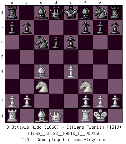 Last move : 1-0 2018 July 3 17:39:25 [Event "FICGS__CHESS__RAPID_C__000166"] [Site "FICGS"] [Date "2018.05.11"] [Round "1"] [White "D Ottavio,Aldo"] [Black "Cafiero,Florian"] [Result "1-0"] [WhiteElo "1668"] [BlackElo "1519"] 1.e4 c5 2.d4 cxd4 3.c3 dxc3 4.Nxc3 Nc6 5.Nf3 d6 6.Bc4 e6 7.O-O 1-0 This chess game has been lost on time (started : 2018.05.11 8:22:4) Sicilian : Smith-Morra gambit Kingside Castling by player White (move 7) Player White won this chess game. Follow this game move after move (download)Chess is a terrible game. If you have no center, your opponent has a freer position. If you do have a center, then you really have something to worry about ! (Siegbert Tarrasch) Ein Remis kann durch Wiederholung von drei Zügen oder durch einen schlechte Zug erreicht werden. (Savielly Grigorievitsch Tartakower) Haz el enroque temprano y seguido. (Rob Sillars) Le joueur d'Echecs qui veut atteindre le top est obligé de développer son propre credo créatif. Alexeï Stepanovicth Souétine. Il est facile d'écrire des livres ! Ce qui est difficile, c'est de jouer ! (Alexeï Stepanovicth Souétine) The meaning of life is that it is to be lived, and it is not to be traded and conceptualized and squeezed into a pattern of systems. (Bruce Lee)