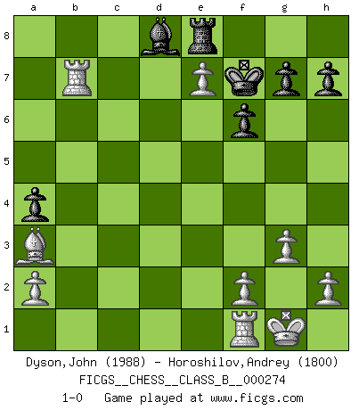 Last move : 1-0 2018 July 20 22:22:23 [Event "FICGS__CHESS__CLASS_B__000274"] [Site "FICGS"] [Date "2018.05.12"] [Round "1"] [White "Dyson,John"] [Black "Horoshilov,Andrey"] [Result "1-0"] [WhiteElo "1988"] [BlackElo "1800"] 1.Nf3 Nf6 2.c4 c5 3.Nc3 e6 4.g3 Be7 5.Bg2 d5 6.cxd5 Nxd5 7.O-O Nxc3 8.bxc3 Nc6 9.d4 cxd4 10.cxd4 O-O 11.Rb1 a5 12.Qd2 Bb4 13.Qd1 Qd7 14.e3 a4 15.Nd2 Bc3 16.Ba3 Re8 17.Ne4 Ba5 18.Qh5 f6 19.Nc5 Qf7 20.Qxf7+ Kxf7 21.Nxb7 Bxb7 22.Rxb7+ Ne7 23.Bc6 Bd8 24.e4 Rc8 25.d5 exd5 26.exd5 Ba5 27.Bxe8+ Rxe8 28.d6 Bd8 29.dxe7 1-0 Reti Opening Kingside Castling by player White (move 7) Kingside Castling by player Black (move 10) Player White won this chess game. Follow this game move after move (download)Some sacrifices are sound; the rest are mine. (Mikhail Tal) Je älter ich werde, um so mehr schätze ich die Bauern. (Paul Keres) Botvinnik trataba de restarle el misterio al Ajedrez, siempre relacionandolo a situaciones de la vida ordinaria. El gustaba de llamar al Ajedrez un típico problema inexacto similar a aquellos de los cuales la gente siempre tiene que enfrentarse en la vida cotidiana. (Garry Kasparov) Mon pion favori sur ma case favorite ! Bronstein en parlant d'un coup de pion en h5 quand il avait les Noirs. I take risks, sometimes patients die, but not taking risks causes more patients to die. So I guess my biggest problem is I've been cursed with the ability to do the math. (Gregory House, House M.D.)