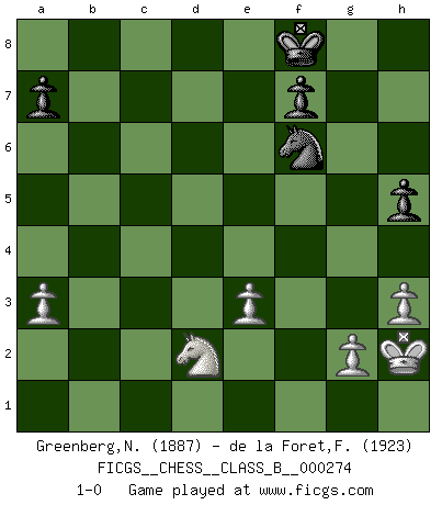 Last move : 1-0 2019 March 2 23:30:45 [Event "FICGS__CHESS__CLASS_B__000274"] [Site "FICGS"] [Date "2018.05.12"] [Round "1"] [White "Greenberg,Normund"] [Black "de la Foret,Fred"] [Result "1-0"] [WhiteElo "1887"] [BlackElo "1923"] 1.d4 Nf6 2.Bf4 c5 3.e3 d5 4.c3 Nc6 5.Nd2 e6 6.Ngf3 Bd6 7.Bxd6 Qxd6 8.Bb5 O-O 9.O-O b6 10.a3 Bb7 11.Re1 Rfd8 12.Rc1 Rac8 13.b4 Ne7 14.Bd3 Rc7 15.Ne5 Rdc8 16.bxc5 bxc5 17.Qa4 Nc6 18.f4 h6 19.Rb1 Qd8 20.Be2 Nxe5 21.dxe5 Bc6 22.Bb5 Bxb5 23.Rxb5 Nd7 24.c4 Rb8 25.Rxb8 Qxb8 26.Qc2 Rb7 27.Rc1 Rb2 28.Qd3 Qc7 29.cxd5 exd5 30.Qxd5 Nb6 31.Qd3 Qc6 32.h3 c4 33.Qd4 Ra2 34.f5 Qc8 35.f6 Qd7 36.Qxd7 Nxd7 37.Nxc4 gxf6 38.exf6 Nxf6 39.Rd1 h5 40.Kh2 Kg7 41.Rd4 Kf8 42.Rd2 Rxd2 43.Nxd2 1-0 Queen's pawn game Kingside Castling by player Black (move 8) Kingside Castling by player White (move 9) Player White won this chess game. Follow this game move after move (download)A bad plan is better than none at all. (Frank Marshall) Alles was am Schachbrett zählt sind gute Züge. (Robert James Fischer) Es muy difícil jugar en contra de la teoría de Einstein. - en su primera derrota en contra de Fischer (Mikhail Tal) C'est la seule position que je connaisse où les deux camps sont mals. Propos prêtés à V. Anand. The obstacle is the path. (Zen proverb)