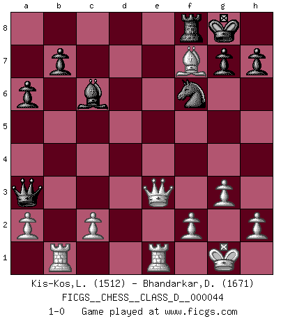 Last move : 1-0 2007 June 25 14:44:30 [Event "FICGS__CHESS__CLASS_D__000044"] [Site "FICGS"] [Date "2007.05.07"] [Round "1"] [White "Kis-Kos,Laszlo"] [Black "Bhandarkar,Dinesh"] [Result "1-0"] [WhiteElo "1512"] [BlackElo "1671"] 1.e4 c5 2.Nf3 e6 3.d4 cxd4 4.Nxd4 a6 5.Nc3 Qc7 6.g3 Nc6 7.Bg2 Nf6 8.O-O Nxd4 9.Qxd4 Bc5 10.Bf4 d6 11.Qd2 O-O 12.Rad1 Ne8 13.Rfe1 Bd7 14.e5 d5 15.Nxd5 exd5 16.e6 Bd6 17.e7 Nf6 18.Bxd6 Qxd6 19.exf8Q+ Rxf8 20.Bxd5 Qb6 21.Qe3 Qxb2 22.Bb3 Bc6 23.Rb1 Qa3 24.Bxf7+ 1-0 Sicilian : Kan, 5.Nc3 Kingside Castling by player White (move 8) Kingside Castling by player Black (move 11) Promotion Queen by player White (move 19) Player White won this chess game. Follow this game move after move (download)Alekhine is a poet who creates a work of art out of something that would hardly inspire another man to send home a picture post card. (Max Euwe) Ich spiele 70 Eröffnungssysteme. (Viktor Kortschnoi) El Ajedrez demanda una total concentración. (Bobby Fischer) Vous n'êtes pas toujours obligé de jouer le meilleur coup. Un coup doit être actif, entreprenant, correct et beau ! (David Bronstein) If everyone is thinking alike, then somebody isn't thinking. (US General George S. Patton)