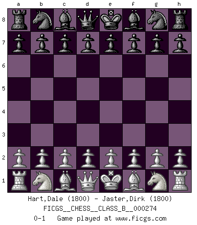 Last move : 0-1 2018 June 21 15:30:2 [Event "FICGS__CHESS__CLASS_B__000274"] [Site "FICGS"] [Date "2018.05.12"] [Round "1"] [White "Hart,Dale"] [Black "Jaster,Dirk"] [Result "0-1"] [WhiteElo "1800"] [BlackElo "1800"] 0-1 This chess game has been lost on time (started : 2018.05.12 5:24:8) Player Black won this chess game. Follow this game move after move (download)Chess makes man wiser and clear-sighted. (Vladimir Putin) Um dein Spiel zu verbessern musst du zuallererst das Endspiel studieren, denn diese kann unabhängig studiert werden. Die Eröffnung und das Mittelspiel müssen immer in Bezug gesetzt werden zum Endspiel. (José Raúl Capablanca) Yo no le temo a Spassky. Todos saben que yo soy el mejor. Uno no necesita un torneo para probarlo. (Bobby Fischer) Karpov est une pièce de musée. (Garry Kasparov) Go and wake up your luck. (Persian saying)