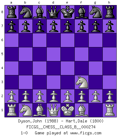 Last move : 1-0 2018 June 21 15:30:2 [Event "FICGS__CHESS__CLASS_B__000274"] [Site "FICGS"] [Date "2018.05.12"] [Round "1"] [White "Dyson,John"] [Black "Hart,Dale"] [Result "1-0"] [WhiteElo "1988"] [BlackElo "1800"] 1.Nf3 1-0 This chess game has been lost on time (started : 2018.05.12 5:24:8) Reti Opening Player White won this chess game. Follow this game move after move (download)It is not a move, even the best move that you must seek, but a realizable plan. (Eugene Znosko-Borovsky) Dass jemand wie Surab Asmaiparaschwili, der selbst Elopunkte gekauft hat , Vize-Präsident der Fide werden konnte, sagt schon einges über den Zustand dieser Organisation aus. (Joel Lautier) La señal de un Gran Maestro es su habilidad de ganar una partida rápidamente y sin dolor. (Irving Chernev) Aucun coup ne doit être joué sans but. (Pedro Damiano) The hypothalamus is one of the most important parts of the brain, involved in many kinds of motivation, among other functions. The hypothalamus controls the 'Four Fs: Fighting, Fleeing, Feeding and Mating. (Unknown author)