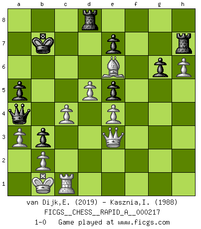 Last move : 1-0 2018 August 4 21:29:19 [Event "FICGS__CHESS__RAPID_A__000217"] [Site "FICGS"] [Date "2018.05.12"] [Round "1"] [White "van Dijk,Erik L."] [Black "Kasznia,Ireneusz"] [Result "1-0"] [WhiteElo "2019"] [BlackElo "1988"] 1.d4 Nf6 2.c4 g6 3.Nc3 Bg7 4.e4 d6 5.f3 O-O 6.Be3 a6 7.Qd2 c6 8.O-O-O b5 9.h4 Qa5 10.Kb1 b4 11.Nce2 h5 12.Bh6 c5 13.d5 Nbd7 14.g4 Kh7 15.Bxg7 Kxg7 16.gxh5 Nxh5 17.Nf4 Nxf4 18.Qxf4 Rh8 19.h5 Nf6 20.h6+ Kf8 21.Nh3 Bxh3 22.Bxh3 b3 23.a3 Qa4 24.Rc1 Rh7 25.Qe3 Nd7 26.f4 Nb6 27.Bf1 Ke8 28.f5 Nd7 29.Qg3 Ne5 30.fxg6 fxg6 31.Rh5 Kd7 32.Rxe5 dxe5 33.Bh3+ Kc7 34.Qg1 Kb7 35.Qxc5 Rd8 36.Be6 a5 37.Qe3 1-0 King's Indian : Saemisch, 5...O-O Kingside Castling by player Black (move 5) Queenside Castling by player White (move 8) Player White won this chess game. Follow this game move after move (download)It is peculiar but a fact nevertheless, that gamblers in chess always have enthusiastic followers. (Botvinnik) Die FIDE ist dabei in die Hände der russischen Mafia zu fallen. (Larry Evans) No es tiempo de jugar al Ajedrez cuando la casa esta en llamas. (Proverbio Italiano) Les ravages du H expliquent la différence de niveau entre Tal et Thal [Abergel]. The only thing that matters is the evidence. (Horatio Caine, C.S.I. Miami)