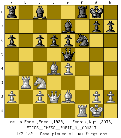 Last move : 1/2-1/2 2018 June 19 8:47:25 [Event "FICGS__CHESS__RAPID_A__000217"] [Site "FICGS"] [Date "2018.05.12"] [Round "1"] [White "de la Foret,Fred"] [Black "Farnik,Kym"] [Result "1/2-1/2"] [WhiteElo "1923"] [BlackElo "2076"] 1.e4 c5 2.Nf3 d6 3.d4 cxd4 4.Nxd4 Nf6 5.Nc3 a6 6.Bg5 e6 7.f4 Qb6 8.Qd2 Qxb2 9.Rb1 Qa3 10.f5 Nc6 11.fxe6 fxe6 12.Nxc6 bxc6 13.Be2 Be7 14.O-O O-O 15.Rb3 Qc5+ 16.Be3 Qe5 17.Bd4 Qa5 18.Bb6 Qe5 19.Bd4 Qa5 20.Bb6 Qe5 21.Bd4 1/2-1/2 Sicilian : Najdorf, 7...Qb6 Kingside Castling by player White (move 14) Kingside Castling by player Black (move 14) This chess game ended in a draw. Follow this game move after move (download)Personally, I rather look forward to a computer program winning the world Chess Championship. Humanity needs a lesson in humility. (Richard Dawkings) Ich habe Putins Aufstieg an die Macht beobachtet und seine Politik, die demokratischen Institutionen meines Landes zu zerstören. (Garry Kasparov) De eso se trata el Ajedrez. Un día le das una lección a tu oponente y al día siguiente el te da una a tí. (Bobby Fischer) Lorsque vous vous retrouvez devant une position atroce, ne tendez pas un ultime piège dérisoire avec l'intention d'abandonner si l'adversaire le déjoue ! Faites-vous plutôt un devoir de résister comme si votre vie en dépendait. Jouez le coup qui vous déplairait au centuple si vous étiez dans la peau de votre tortionnaire ! There are two kinds of tragedy in this world, one is not getting what you want and the other is getting. (Lord of war)