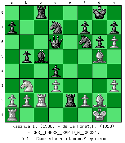 Last move : 0-1 2018 June 24 12:34:23 [Event "FICGS__CHESS__RAPID_A__000217"] [Site "FICGS"] [Date "2018.05.12"] [Round "1"] [White "Kasznia,Ireneusz"] [Black "de la Foret,Fred"] [Result "0-1"] [WhiteElo "1988"] [BlackElo "1923"] 1.Nf3 Nf6 2.g3 d5 3.Bg2 c6 4.O-O Bg4 5.d3 Nbd7 6.Nbd2 e5 7.h3 Bh5 8.e4 Bd6 9.exd5 cxd5 10.c4 d4 11.c5 Bxc5 12.Nc4 O-O 13.g4 e4 14.gxh5 b5 15.Ncd2 exf3 16.Qxf3 Rc8 17.h6 g6 18.Nb3 Ne5 19.Qe2 Re8 20.Bg5 Qd6 21.Rfc1 Ned7 22.Rc2 Rxe2 0-1 Reti Opening Kingside Castling by player White (move 4) Kingside Castling by player Black (move 12) Player Black won this chess game. Follow this game move after move (download)It began to feel as though you were playing against Chess itself. - On playing against Robert Fischer. (Walter Shipman) Ein typischer, sehr verbreiteter Gedankenschädling ist der, daß der betreffende Amateur von der Annanhme ausgeht, daß jeder einzelne Zug etwas zu leisten habe. (Aaron Nimzowitsch) El ganador de una partida es aquel jugador que hace el penúltimo error. (Savielly Tartakover) L'ordinateur a tué l'originalité. Il n'y a plus guère d'aventures sur l'échiquier. (Jacob Murray) Strategy without tactics is the slowest route to victory. Tactics without strategy is the noise before defeat. (Sun Tzu)