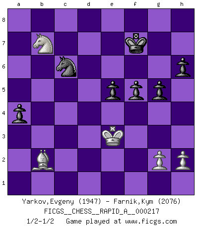 Last move : 1/2-1/2 2018 July 8 15:31:49 [Event "FICGS__CHESS__RAPID_A__000217"] [Site "FICGS"] [Date "2018.05.12"] [Round "1"] [White "Yarkov,Evgeny"] [Black "Farnik,Kym"] [Result "1/2-1/2"] [WhiteElo "1947"] [BlackElo "2076"] 1.e4 c5 2.Nf3 d6 3.d4 cxd4 4.Nxd4 Nf6 5.Nc3 a6 6.Bg5 e6 7.f4 Qb6 8.Qd2 Qxb2 9.Rb1 Qa3 10.e5 dxe5 11.fxe5 Nfd7 12.Ne4 h6 13.Bh4 Qxa2 14.Rd1 Qd5 15.Qe3 Qxe5 16.Be2 Bc5 17.Bg3 Bxd4 18.Rxd4 Qa5+ 19.Rd2 O-O 20.Bd6 Re8 21.O-O Nc6 22.Qg3 Ne7 23.Bc7 b6 24.Rxd7 Bxd7 25.Nf6+ Kh8 26.Nxd7 f6 27.Bxb6 Qa4 28.Qd6 Qxc2 29.Bh5 Nf5 30.Qd1 Qc4 31.Bxe8 Rxe8 32.Bf2 Rd8 33.Nb6 Rxd1 34.Nxc4 Rxf1+ 35.Kxf1 Kg8 36.Na5 Kf7 37.Nb3 Ne7 38.Be1 Nc6 39.Kf2 e5 40.Ke3 f5 41.Bc3 g5 42.Nc5 a5 43.Nb7 a4 44.Bb2 1/2-1/2 Sicilian : Najdorf, 7...Qb6 Kingside Castling by player Black (move 19) Kingside Castling by player White (move 21) This chess game ended in a draw. Follow this game move after move (download)When you play Bobby, it is not a question if you win or lose. It is a question if you survive. (Boris Spassky) Der Vorposten provoziert a) eine Basis für neue Angriffe und b) eine Schwächung der gegnerischen Widerstandskraft in der fraglichen Linie. (Aaron Nimzowitsch) Sin errores no puede haber brillantez. (Emanuel Lasker) Mais l'homme est une créature légère et illogique : semblable au joueur d'échecs, il n'aime que le processus du but à atteindre, non le but lui-même. (Dostoïevsky) Big Chess is a place for big hallucinations. (Thibault de Vassal)