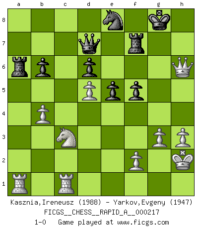 Last move : 1-0 2018 July 23 15:29:48 [Event "FICGS__CHESS__RAPID_A__000217"] [Site "FICGS"] [Date "2018.05.12"] [Round "1"] [White "Kasznia,Ireneusz"] [Black "Yarkov,Evgeny"] [Result "1-0"] [WhiteElo "1988"] [BlackElo "1947"] 1.Nf3 Nf6 2.g3 g6 3.Bg2 Bg7 4.c4 O-O 5.d4 d6 6.Nc3 Nbd7 7.O-O e5 8.e4 c6 9.h3 Qb6 10.d5 cxd5 11.cxd5 Nc5 12.Re1 Bd7 13.Bf1 a5 14.Nd2 a4 15.Nc4 Qc7 16.Na3 b6 17.Nab5 Qb8 18.Rb1 Ne8 19.b4 axb3 20.axb3 f5 21.exf5 gxf5 22.b4 Na6 23.Bg5 h6 24.Be3 Nac7 25.Kh2 Nxb5 26.Bxb5 Rf7 27.Bc6 Ra6 28.Bxd7 Rxd7 29.Qh5 Rf7 30.Bxh6 Bxh6 31.Qxh6 Qc8 32.Rec1 Qd7 33.Ra1 1-0 Reti : King's Indian attack Kingside Castling by player Black (move 4) Kingside Castling by player White (move 7) Player White won this chess game. Follow this game move after move (download)Chess is everything: art, science and sport. (Anatoly Karpov) Im Leben werden Partien nie so unstrittig gewonnen wie im Spiel (Emanuel Lasker) No es tiempo de jugar al Ajedrez cuando la casa esta en llamas. (Proverbio Italiano) Aucun coup ne doit être joué sans but. (Pedro Damiano) Quotation,n.: The act of repeating erroneously the words of another. The words erroneously repeated. (Ambrose Bierce, The Devil's Dictionary)