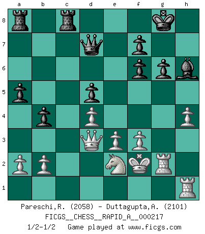 Last move : 1/2-1/2 2018 August 20 11:35:49 [Event "FICGS__CHESS__RAPID_A__000217"] [Site "FICGS"] [Date "2018.05.12"] [Round "1"] [White "Pareschi,Remo"] [Black "Duttagupta,Aniruddha"] [Result "1/2-1/2"] [WhiteElo "2058"] [BlackElo "2101"] 1.d4 Nf6 2.c4 g6 3.Nc3 d5 4.Nf3 Bg7 5.h4 c6 6.cxd5 cxd5 7.Bf4 Nc6 8.e3 O-O 9.Be2 Bg4 10.Qb3 Qd7 11.Ne5 Nxe5 12.Bxe5 Bxe2 13.Nxe2 Rfc8 14.f3 a5 15.Kf2 h5 16.Rag1 b5 17.Qd3 b4 18.g4 hxg4 19.Bxf6 exf6 20.Rxg4 Bh6 21.Rg2 1/2-1/2 King's Indian defense, 3.Nc3 Kingside Castling by player Black (move 8) This chess game ended in a draw. Follow this game move after move (download)If I win a tournament, I win it by myself. I do the playing. Nobody helps me. (Bobby Fischer) Die Jungen erwarten, dass Opa einfach umfällt. Dann aber kann Opa fünf Stunden lang Schach spielen und die jungen Gegner an die Wand drücken. (Viktor Kortschnoi) Morphy probablemente fue el genio más grande de todos. (Bobby Fischer) A ce moment-là, je menaçais de comprendre la position ! (Clément L'Heureux) A mistake is only a mistake if you let it happen twice. Otherwise it is a learning experience. (Daniel Parmet)