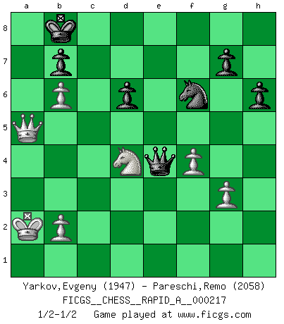 Last move : 1/2-1/2 2018 October 2 5:54:37 [Event "FICGS__CHESS__RAPID_A__000217"] [Site "FICGS"] [Date "2018.05.12"] [Round "1"] [White "Yarkov,Evgeny"] [Black "Pareschi,Remo"] [Result "1/2-1/2"] [WhiteElo "1947"] [BlackElo "2058"] 1.e4 e5 2.Nf3 Nc6 3.d4 exd4 4.Nxd4 Bc5 5.Nb3 Bb6 6.Nc3 Qf6 7.Qe2 Nge7 8.Be3 d6 9.O-O-O Bd7 10.Bxb6 axb6 11.Kb1 O-O-O 12.f3 Kb8 13.Qf2 Qh6 14.Bd3 f5 15.exf5 Nxf5 16.g3 Ne5 17.Be4 Rde8 18.a3 Rhf8 19.f4 Ng4 20.Qd2 Nf6 21.Bf3 Re3 22.Rhf1 Qh3 23.a4 R3e8 24.Rfe1 Rxe1 25.Rxe1 Re8 26.Rxe8+ Nxe8 27.Ka2 Nf6 28.Qe2 h6 29.Nb5 Bc6 30.a5 Bxf3 31.Qxf3 c6 32.axb6 Qxh2 33.Qd3 cxb5 34.Qxf5 Qf2 35.Qxb5 Qxc2 36.Nd4 Qd2 37.Qa4 Qg2 38.Qa5 Qe4 1/2-1/2 Scotch : Potter variation Queenside Castling by player White (move 9) Queenside Castling by player Black (move 11) This chess game ended in a draw. Follow this game move after move (download)I give 98 percent of my mental energy to Chess. Others give only 2 percent. (Bobby Fischer) Gegen einen Schachcomputer zu verlieren ist wie Löcher in den Strümpfen zuhaben. Es ist nicht peinlich, solange man der einzige ist der es weiß. (Anonymous) La única cosa que los jugadores de Ajedrez tienen en común, es el Ajedrez. (Lodewijk Prins) Mais n'est-ce pas déjà le limiter injurieusement que d'appeler les échecs un jeu? N'est-ce pas aussi une science, un art, ou quelque chose qui, comme le cercueil de Mahomet entre ciel et terre, est suspendu entre l'un et l'autre, et qui réunit un nombre incroyable de contraires ? (Stefan Zweig) But they are useless. They can only give you answers. (Pablo Picasso, about computers)