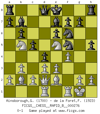 Last move : 0-1 2018 July 20 20:6:28 [Event "FICGS__CHESS__RAPID_B__000276"] [Site "FICGS"] [Date "2018.05.12"] [Round "1"] [White "Ainsborough,Gregory"] [Black "de la Foret,Fred"] [Result "0-1"] [WhiteElo "1700"] [BlackElo "1923"] 1.f4 Nf6 2.Nf3 d5 3.b3 c5 4.e3 Nc6 5.Bb2 e6 6.Be2 Bd6 7.O-O b6 8.Ne5 Ne7 9.d3 Bb7 10.Na3 Nf5 11.Qd2 h5 12.Nb5 Be7 13.Rad1 d4 0-1 This chess game has been lost on time (started : 2018.05.12 19:40:1) Bird's Opening Kingside Castling by player White (move 7) Player Black won this chess game. Follow this game move after move (download)I prefer to lose a really good game than to win a bad one. (David Levy) Karpov ist ein Museumsstück. (Garry Kasparov) ¿Cual es el objetivo de jugar una apertura de gambito?... Para adquirir una reputación de ser un jugador apuesto a costo de perder el juego. (Siegbert Tarrasch) Il a essayé de se convaincre qu'il pourrait empêcher toutes les erreurs et ne jamais perdre. L'horreur ! Gary Kasparov au sujet de Robert Fischer. Wisdom is the reward you get for a lifetime of listening when you'd have preferred to talk. (Doug Larson)