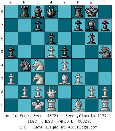 Last move : 1-0 2018 June 14 21:41:39 [Event "FICGS__CHESS__RAPID_B__000276"] [Site "FICGS"] [Date "2018.05.12"] [Round "1"] [White "de la Foret,Fred"] [Black "Perez,Alberto"] [Result "1-0"] [WhiteElo "1923"] [BlackElo "1774"] 1.e4 d6 2.d4 g6 3.Nc3 Bg7 4.Be3 Nf6 5.f3 O-O 6.Nge2 Nc6 7.Qd2 e5 8.O-O-O b5 9.Nxb5 Rb8 10.d5 a6 11.Na3 Nb4 12.Nc3 Nh5 13.Nc4 a5 14.a3 1-0 King's pawn Opening Kingside Castling by player Black (move 5) Queenside Castling by player White (move 8) Player White won this chess game. Follow this game move after move (download)The beauty of a move lies not in its' appearance but in the thought behind it. (Siegbert Tarrasch) Es ist peinlich, dass ich nie Weltmeister wurde. Es wäre leicht, Leonid Breschnjew als Ursache vorzuschieben, dessen Apparat den Vorzeigekommunisten Anatoli Karpow in allem unterstützte. Aber Garri Kasparow zum Beispiel, der ebenfalls von den Sowjets unerwünscht war, hat trotz der Widerstände den WM-Titel erobert. (Viktor Kortschnoi) Si el ingenio solamente fuese necesario para lucirse, las mujeres serían las mejores jugadoras de Ajedrez del mundo. (Albin) Le profane ne songe pas à la somme de jouissance dont il se prive, qui méconnaît ce jeu aux ressources aussi variées que passionnantes. (Jean-Marie Jeanton-Lamarche) I'll be back. (Arnold Schwarzenegger)