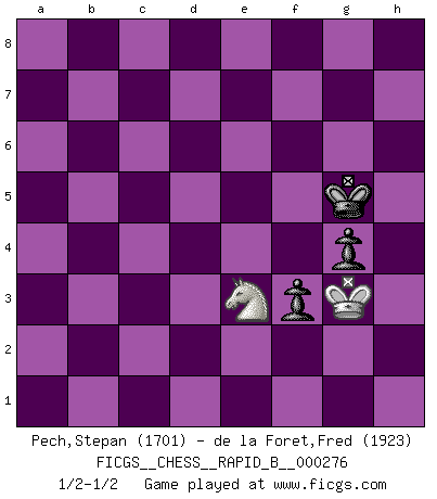 Last move : 1/2-1/2 2018 December 20 11:17:44 [Event "FICGS__CHESS__RAPID_B__000276"] [Site "FICGS"] [Date "2018.05.12"] [Round "1"] [White "Pech,Stepan"] [Black "de la Foret,Fred"] [Result "1/2-1/2"] [WhiteElo "1701"] [BlackElo "1923"] 1.d4 Nf6 2.c4 e6 3.Nf3 d5 4.Nc3 c5 5.cxd5 Nxd5 6.e4 Nxc3 7.bxc3 cxd4 8.cxd4 Bb4+ 9.Bd2 Be7 10.Bc4 O-O 11.O-O Nc6 12.d5 exd5 13.exd5 Nb4 14.Re1 a5 15.a3 b5 16.axb4 bxc4 17.Bc3 Bb7 18.bxa5 Bc5 19.Nd2 Qxd5 20.Ne4 Qxd1 21.Raxd1 Ba3 22.Ra1 Be7 23.Nd2 Rfe8 24.Nxc4 Ba6 25.Ne3 Rad8 26.Rab1 h6 27.Rb6 Bd3 28.h3 Bc5 29.Rc6 Rc8 30.Rxc8 Rxc8 31.Nd5 Rd8 32.Ne7+ Kh7 33.Nc6 Rc8 34.Nb4 Bc4 35.Rd1 Rb8 36.Nc6 Rc8 37.Nd4 Ba6 38.Nc2 Bxf2+ 39.Kxf2 Rxc3 40.Nb4 Bc8 41.Rd8 Bf5 42.a6 Ra3 43.g4 Be6 44.Rb8 g5 45.Rb6 h5 46.Rb7 Rxh3 47.gxh5 Kh6 48.a7 Ra3 49.Nc2 Ra2 50.Ke3 Bd5 51.Rb6+ Kxh5 52.Nb4 Ra3+ 53.Kd4 Bf3 54.Ra6 Rxa6 55.Nxa6 f5 56.Nc7 Bb7 57.a8Q Bxa8 58.Nxa8 f4 59.Nc7 f3 60.Ke3 g4 61.Nd5 Kh4 62.Kf2 Kg5 63.Kg3 Kg6 64.Ne3 Kg5 1/2-1/2 Queen's pawn game Kingside Castling by player Black (move 10) Kingside Castling by player White (move 11) 10 pieces endgame at move 47 : White KRNPP , Black KRBPP WHITE : King + 1 Rook 1 Knight 2 Pawns BLACK : King + 1 Rook 1 Bishop 2 Pawns 9 pieces endgame at move 51 : White KRNP , Black KRBPP WHITE : King + 1 Rook 1 Knight 1 Pawn BLACK : King + 1 Rook 1 Bishop 2 Pawns 8 pieces endgame at move 54 : White KNP , Black KRBPP WHITE : King + 1 Knight 1 Pawn BLACK : King + 1 Rook 1 Bishop 2 Pawns 7 pieces endgame at move 55 : White KNP , Black KBPP WHITE : King + 1 Knight 1 Pawn BLACK : King + 1 Bishop 2 Pawns Promotion Queen by player White (move 57) 6 pieces endgame at move 57 : White KN , Black KBPP WHITE : King + 1 Knight BLACK : King + 1 Bishop 2 Pawns 5 pieces endgame at move 58 : White KN , Black KPP WHITE : King + 1 Knight BLACK : King + 2 Pawns This chess game ended in a draw. Follow this game move after move (download)The tactician knows what to do when there is something to do; whereas the strategian knows what to do when there is nothing to do. (Gerald Abrahams) Wie gewinnt Tal? Er entwickelt alle seine Figuren in die Brettmitte und opfert sie dann irgendwo. (Robert James Fischer) La táctica fluye a partir de una posición superior. (Bobby Fischer) Les Echecs ont trois composantes : le temps, l'espace et le matériel en dernier. (Mikhail Tal) I've never seen so many men wasted so badly. (Blondie in The Good, The Bad and The Ugly)