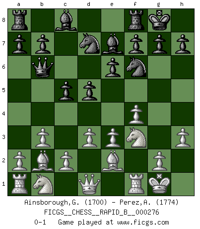 Last move : 0-1 2018 June 28 4:56:26 [Event "FICGS__CHESS__RAPID_B__000276"] [Site "FICGS"] [Date "2018.05.12"] [Round "1"] [White "Ainsborough,Gregory"] [Black "Perez,Alberto"] [Result "0-1"] [WhiteElo "1700"] [BlackElo "1774"] 1.f4 d5 2.Nf3 c6 3.b3 Nf6 4.Bb2 e6 5.e3 Be7 6.Be2 O-O 7.O-O Nbd7 8.d3 c5 9.h3 Qb6 0-1 This chess game has been lost on time (started : 2018.05.12 19:40:1) Bird's Opening Kingside Castling by player Black (move 6) Kingside Castling by player White (move 7) Player Black won this chess game. Follow this game move after move (download)He who takes the Queen's Knight's Pawn will sleep in the streets. (Anonymous) Ich könnte leicht behaupten: Ja,ja, Leonid Breschnew wollte nicht, daß ich Weltmeister werde. In der Tat war die Sache komplizierter. (Viktor Kortschnoi) El Ajedrez no es como la vida... ¡tiene reglas!. (Mark Pasternak) Mais l'homme est une créature légère et illogique : semblable au joueur d'échecs, il n'aime que le processus du but à atteindre, non le but lui-même. (Dostoïevsky) History is a gallery of pictures in which there are few originals and many copies. (Alexis de Tocqueville)