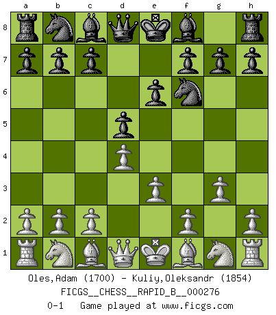 Last move : 0-1 2018 June 17 3:10:33 [Event "FICGS__CHESS__RAPID_B__000276"] [Site "FICGS"] [Date "2018.05.12"] [Round "1"] [White "Oles,Adam"] [Black "Kuliy,Oleksandr"] [Result "0-1"] [WhiteElo "1700"] [BlackElo "1854"] 1.d4 d5 2.e3 Nf6 3.g3 e6 0-1 This chess game has been lost on time (started : 2018.05.12 19:40:1) Queen's pawn game Player Black won this chess game. Follow this game move after move (download)Excellence at Chess is one mark of a scheming mind. (Sir Arthur Conan Doyle) Das Schachspiel hat wie die Liebe, die Musik, die Fähigkeit, den Menschen glücklich zu machen. Ich habe ein leises Gefühl des Bedauerns für jeden, der das Schachspiel nicht kennt, so wie ich jeden bedaure, der die Liebe nicht kennt. (Siegbert Tarrasch) El pensamiento metódico es mas útil en el Ajedrez que la inspiración. (C. J. S. Purdy) Avec des compensations pour le matériel en plus... (Anonyme) All battles are fought by scared men who'd rather be someplace else. (John Wayne in the movie In harm's way)