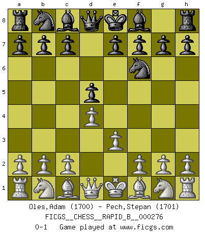 Last move : 0-1 2018 June 20 15:22:35 [Event "FICGS__CHESS__RAPID_B__000276"] [Site "FICGS"] [Date "2018.05.12"] [Round "1"] [White "Oles,Adam"] [Black "Pech,Stepan"] [Result "0-1"] [WhiteElo "1700"] [BlackElo "1701"] 1.d4 Nf6 2.e3 d5 0-1 This chess game has been lost on time (started : 2018.05.12 19:40:1) Queen's pawn game Player Black won this chess game. Follow this game move after move (download)Chess holds its master in its own bonds, shackling the mind and brain so that the inner freedom of the very strongest must suffer. (Albert Einstein) Ein Isolani verdüstert die Stimmung auf dem ganzen Schachbrett. (Savielly Grigorievitsch Tartakower) Nada excita más a Grandes Maestros aburridos que una novedad teórica. (Dominic Lawson) Vous n'êtes pas toujours obligé de jouer le meilleur coup. Un coup doit être actif, entreprenant, correct et beau ! (David Bronstein) Creativity is allowing yourself to make mistakes. Art is knowing which ones to keep. (Scott Adams)