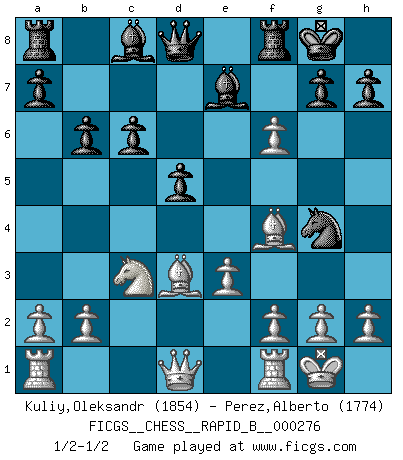 Last move : 1/2-1/2 2018 May 21 17:38:40 [Event "FICGS__CHESS__RAPID_B__000276"] [Site "FICGS"] [Date "2018.05.12"] [Round "1"] [White "Kuliy,Oleksandr"] [Black "Perez,Alberto"] [Result "1/2-1/2"] [WhiteElo "1854"] [BlackElo "1774"] 1.d4 d5 2.c4 e6 3.Nf3 Nf6 4.Nc3 Be7 5.Bg5 O-O 6.e3 c6 7.Bd3 Nbd7 8.O-O b6 9.cxd5 exd5 10.Ne5 Nxe5 11.dxe5 Ng4 12.Bf4 f6 13.exf6 1/2-1/2 Queen's gambit declined Kingside Castling by player Black (move 5) Kingside Castling by player White (move 8) This chess game ended in a draw. Follow this game move after move (download)We must make sure that Chess will not be like a dead language, very interesting, but for a very small group. (Sytze Faber) Sie bekommen vielleicht den Eindruck, dass die Spitzenspieler überhaupt gar nicht so stark sind. Aber das stimmt nicht. Es ist eine Illusion. Mit einem Computer an der Seite ist es sehr leicht, Urteile zu fällen, aber wenn man alleine am Brett sitzt, sieht die Sache ganz anders aus. (Vladimir Kramnik) Debió haber existido una vez en que los hombres eran semidióses, de otra manera no hubiesen podido inventar el Ajedrez. (Gustav Schenk) On peut tirer plus d'utilité d'une partie perdue que de 100 parties gagnées. (Capablanca) Don't anthropomorphize computers - they hate it. (Anonymous)