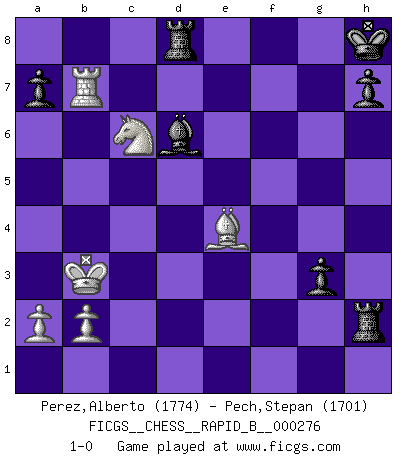 Last move : 1-0 2018 September 13 4:34:15 [Event "FICGS__CHESS__RAPID_B__000276"] [Site "FICGS"] [Date "2018.05.12"] [Round "1"] [White "Perez,Alberto"] [Black "Pech,Stepan"] [Result "1-0"] [WhiteElo "1774"] [BlackElo "1701"] 1.c4 e5 2.Nc3 Nc6 3.d3 Nf6 4.g3 d5 5.cxd5 Nxd5 6.Bg2 Nb6 7.f4 exf4 8.Bxf4 Be7 9.Nf3 O-O 10.O-O Be6 11.d4 f5 12.e3 Bc4 13.Re1 g5 14.Be5 g4 15.Nd2 Nxe5 16.dxe5 c6 17.Nxc4 Qxd1 18.Raxd1 Nxc4 19.Rd7 Bg5 20.Rxb7 Nxe5 21.Kf2 Nd3+ 22.Ke2 Nxe1 23.Kxe1 Rae8 24.Bxc6 Rxe3+ 25.Kd1 f4 26.gxf4 Bxf4 27.Be4 Rd8+ 28.Kc2 Rh3 29.Kb3 Rxh2 30.Nd5 Bg5 31.Nc7 Bf6 32.Ka3 g3 33.Nd5 Be5 34.Ne7 Kh8 35.Nc6 Bd6+ 36.Kb3 1-0 English : Sicilian Reversed Kingside Castling by player Black (move 9) Kingside Castling by player White (move 10) Player White won this chess game. Follow this game move after move (download)Avoid the crowd. Do your own thinking independently. Be the Chess player, not the Chess piece. (Ralph Charell) Modernes Schach erfordert enorme Anspannung. Es ist für einen normalen Menschen unmöglich das auszuhalten. (Viktor Kortschnoi) El juego de Damas es para vagabundos. (Paul Morphy) Des points faibles ou des trous dans la position de l'adversaire doivent être occupés par des pièces et non pas par des pions. (Siegbert Tarrasch) As the days dwindle down... to a precious few. (Maxwell Anderson)