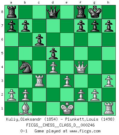 Last move : 0-1 2018 August 17 22:46:54 [Event "FICGS__CHESS__CLASS_D__000246"] [Site "FICGS"] [Date "2018.05.12"] [Round "1"] [White "Kuliy,Oleksandr"] [Black "Plunkett,Louis"] [Result "0-1"] [WhiteElo "1854"] [BlackElo "1498"] 1.d4 d5 2.c4 Nc6 3.Nf3 Bg4 4.Bf4 e6 5.e3 Bb4+ 6.Nc3 Nge7 7.Rc1 O-O 8.h3 Bxf3 9.Qxf3 Ng6 10.cxd5 exd5 11.Bd3 Nxf4 12.Qxf4 Bxc3+ 13.Rxc3 Nb4 14.Bb1 c6 0-1 This chess game has been lost on time (started : 2018.05.12 19:41:3) QGD : Chigorin defense Kingside Castling by player Black (move 7) Player Black won this chess game. Follow this game move after move (download)Chess is the art of analysis. (Mikhail Botvinnik) Frage des Reporters: -Worin besteht das Ziel von Gambiteröffnungen? Antwort: -Auf Kosten der Partie einen Ruf als Angriffspieler zu erwerben.- (Siegbert Tarrasch) Un jugador que es sorprendido, esta derrotado a medias. (Proverbio) Karpov est une pièce de musée. (Garry Kasparov) The real voyage of discovery consists not in seeking new lands but in seeing with new eyes. (Marcel Proust)