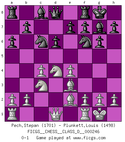 Last move : 0-1 2018 July 28 8:37:40 [Event "FICGS__CHESS__CLASS_D__000246"] [Site "FICGS"] [Date "2018.05.12"] [Round "1"] [White "Pech,Stepan"] [Black "Plunkett,Louis"] [Result "0-1"] [WhiteElo "1701"] [BlackElo "1498"] 1.e4 c5 2.Nf3 Nc6 3.d4 cxd4 4.Nxd4 g6 5.c4 Bg7 6.Be3 Nf6 7.Nc3 O-O 8.Be2 d6 9.O-O a6 0-1 This chess game has been lost on time (started : 2018.05.12 19:41:3) Sicilian : Accelerated Fianchetto, Maroczy bind, 6.Be3 Kingside Castling by player Black (move 7) Kingside Castling by player White (move 9) Player Black won this chess game. Follow this game move after move (download)In order to improve your game, you must study the endgame before everything else, for whereas the endings can be studied and mastered by themselves, the middle game and the opening must be studied in relation to the endgame. (Jose Raul Capablanca) Ich möchte Schüler heranbilden, die das Vermögen haben, selbst zu denken und Kritik zu üben. (Emanuel Lasker) De todos mis libros Rusos, la defensa contiene y difunde el 'calor' mas grande que pudiese verse extraño al observar lo supremamente abstracto que el Ajedrez supuestamente es. (Vladimir Nabokov) Un footballeur joue avec ses pieds, parfois avec sa tête. Un joueur d'échecs ne joue qu'avec sa tête. Et quand il ne joue plus, il meurt. (Jacob Murray) You have to believe in yourself. (Sun Tzu)