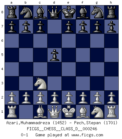 Last move : 0-1 2018 June 23 3:52:0 [Event "FICGS__CHESS__CLASS_D__000246"] [Site "FICGS"] [Date "2018.05.12"] [Round "1"] [White "Azari,Muhammadreza"] [Black "Pech,Stepan"] [Result "0-1"] [WhiteElo "1452"] [BlackElo "1701"] 1.Nc3 d5 0-1 This chess game has been lost on time (started : 2018.05.12 19:41:3) Dunst (Sleipner, Heinrichsen) Opening Player Black won this chess game. Follow this game move after move (download)The laws of Chess do not permit a free choice: you have to move whether you like it or not. (Emanuel Lasker) Jede Eröffnung ist gut genug um gespielt zu werden, wenn nur ihr Ruf schlecht genug ist. (Savielly Grigorievitsch Tartakower) El Ajedrez es sobre todo, ¡una pelea!. (Emanuel Lasker) Ce n'est pas pour s'amuser qu'il joue aux échecs : il célèbre un culte. (Vladimir Nabokov) I believe in luck. How else can you explain the success of those you dislike ? (Jean Cocteau)