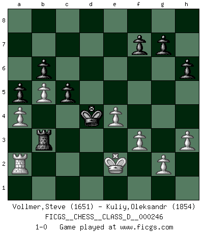 Last move : 1-0 2018 August 15 22:20:5 [Event "FICGS__CHESS__CLASS_D__000246"] [Site "FICGS"] [Date "2018.05.12"] [Round "1"] [White "Vollmer,Steve"] [Black "Kuliy,Oleksandr"] [Result "1-0"] [WhiteElo "1651"] [BlackElo "1854"] 1.d4 d5 2.c4 e6 3.Nc3 Nf6 4.Nf3 Be7 5.Bg5 h6 6.Bxf6 Bxf6 7.e3 O-O 8.Bd3 c6 9.O-O Nd7 10.Qd2 Re8 11.Rfd1 b6 12.Rac1 Bb7 13.b4 dxc4 14.Bxc4 a5 15.b5 c5 16.d5 Bxc3 17.Rxc3 Bxd5 18.Bxd5 exd5 19.Qxd5 Nf6 20.Qxd8 Raxd8 21.Rcd3 Rxd3 22.Rxd3 Ne4 23.a4 Kf8 24.Kf1 Re6 25.Nd2 Nxd2+ 26.Rxd2 Ke7 27.Ke2 Re4 28.Ra2 Ke6 29.f3 Rh4 30.h3 Rb4 31.Kd3 Rb3+ 32.Kd2 Kd5 33.e4+ Kd4 34.Ke2 1-0 QGD : 4.Nf3 Kingside Castling by player Black (move 7) Kingside Castling by player White (move 9) Player White won this chess game. Follow this game move after move (download)In order to improve your game, you must study the endgame before everything else, for whereas the endings can be studied and mastered by themselves, the middle game and the opening must be studied in relation to the endgame. (Jose Raul Capablanca) Ich weiss nicht was Gott gegen mich auf 1.e4 antworten würde. (Robert James Fischer) Debió haber existido una vez en que los hombres eran semidióses, de otra manera no hubiesen podido inventar el Ajedrez. (Gustav Schenk) Si le désir cupide (et stupide) de gagner est une inépuisable source de souffrance, une combinaison brillante sur l'échiquier est une découverte : le coquelicot qui s'épanouit lorsque apparaît la Voie Lactée. (Arrabal) It's not enough to succeed. Others must fail. (Gore Vidal)