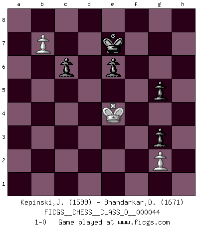 Last move : 1-0 2007 October 30 4:46:41 [Event "FICGS__CHESS__CLASS_D__000044"] [Site "FICGS"] [Date "2007.05.07"] [Round "1"] [White "Kepinski,Janusz"] [Black "Bhandarkar,Dinesh"] [Result "1-0"] [WhiteElo "1599"] [BlackElo "1671"] 1.d4 d5 2.c4 c6 3.e4 dxe4 4.f3 exf3 5.Nxf3 Nf6 6.Bd3 Bg4 7.O-O e6 8.Qb3 Qb6 9.Qxb6 axb6 10.Ne5 Nbd7 11.Nxg4 Nxg4 12.Nc3 Be7 13.Be2 Ngf6 14.Bg5 O-O 15.a3 Rfe8 16.Rad1 h6 17.Bf4 Nf8 18.Bc7 Bd8 19.Be5 Ng6 20.Rd3 Nd7 21.Bd6 Rc8 22.Bh5 Bf6 23.Ne4 c5 24.dxc5 bxc5 25.Nxf6+ Nxf6 26.Bxg6 fxg6 27.Re1 Rcd8 28.Red1 Ne4 29.b4 cxb4 30.axb4 Nxd6 31.Rxd6 Rxd6 32.Rxd6 Re7 33.Kf2 Kf7 34.Kf3 Kf6 35.Ke4 h5 36.c5 g5 37.b5 g4 38.b6 g5 39.Rd8 h4 40.Rf8+ Kg7 41.Rc8 Kf6 42.Rc7 g3 43.hxg3 hxg3 44.Rxe7 Kxe7 45.c6 bxc6 46.b7 1-0 QGD Slav defense Kingside Castling by player White (move 7) Kingside Castling by player Black (move 14) 10 pieces endgame at move 44 : White KRPPP , Black KPPPP WHITE : King + 1 Rook 3 Pawns BLACK : King + 4 Pawns 9 pieces endgame at move 44 : White KPPP , Black KPPPP WHITE : King + 3 Pawns BLACK : King + 4 Pawns 8 pieces endgame at move 45 : White KPP , Black KPPPP WHITE : King + 2 Pawns BLACK : King + 4 Pawns Player White won this chess game. Follow this game move after move (download)During a Chess competition a Chessmaster should be a combination of a beast of prey and a monk. (Alexander Alekhine) Ich verstehe den Grund nicht, warum die Aufteilung in Frauen und Männer überhaupt im Schach besteht. (Judith Polgar) Con o sin el título, Bobby Fischer fue sin lugar a dudas el mas grande jugador de su época. (Burt Hochberg) Ce qui caractérise les parties de combat, c'est que si le défenseur a constamment de difficiles problèmes à résoudre, l'attaquant doit chercher sans relâche de nouvelles possibilités d'attaque. (Koblentz) Lottery : A tax on people who are bad at math. (Author unknown)