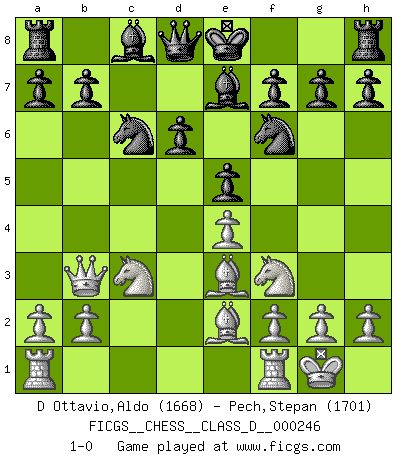 Last move : 1-0 2018 July 30 8:46:10 [Event "FICGS__CHESS__CLASS_D__000246"] [Site "FICGS"] [Date "2018.05.12"] [Round "1"] [White "D Ottavio,Aldo"] [Black "Pech,Stepan"] [Result "1-0"] [WhiteElo "1668"] [BlackElo "1701"] 1.e4 c5 2.d4 cxd4 3.c3 dxc3 4.Nxc3 Nc6 5.Nf3 d6 6.Be2 e5 7.O-O Be7 8.Be3 Nf6 9.Qb3 1-0 This chess game has been lost on time (started : 2018.05.12 19:41:3) Sicilian : Smith-Morra gambit Kingside Castling by player White (move 7) Player White won this chess game. Follow this game move after move (download)First-class players lose to second class players because second-class players sometimes play a first-class game. (Tarrasch) Der Schachmeister von Heute braucht Courage, einen Killerinstinkt, Ausdauer und Arroganz. (Larry Evans) Muchos jugadores de Ajedrez se sorprendían cuando después de la partida, Fischer explicaba con calma: 'Yo ya había analizado esta posibilidad' en una posición en la cual yo creía que no era posible de prever desde la apertura. (Mikhail Tal) RxDa4 pat (...) Yoga is 99% practice and 1% knowledge. (Sri Krishna Pattabhi Jois)