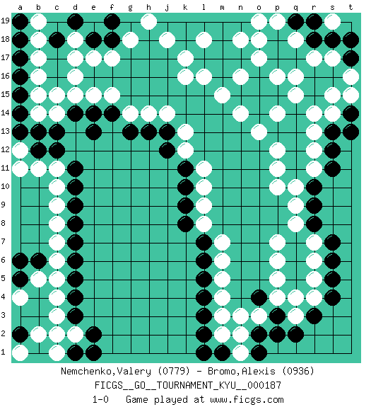 Last move : 1-0 2018 November 8 10:9:42 [Event "FICGS__GO__TOURNAMENT_KYU__000187"] [Site "FICGS"] [Date "2018.05.14"] [Round "1"] [Black "Nemchenko,Valery"] [White "Bromo,Alexis"] [Result "1-0"] [Rating 1 "0779"] [Rating 2 "0936"] 1.d4 q16 2.q4 d16 3.e14 d15 4.d14 c14 5.c13 b14 6.b13 f15 7.f14 g14 8.g13 h14 9.h13 j14 10.j13 k13 11.j12 k12 12.k11 l11 13.k10 l10 14.k9 l9 15.k8 l8 16.l7 m7 17.l6 m6 18.l5 m5 19.l4 m4 20.l3 m3 21.l2 m2 22.m1 n1 23.l1 n2 24.p3 o3 25.p2 p5 26.q5 p6 27.q6 p7 28.q7 q8 29.r8 q9 30.r9 q10 31.r10 r11 32.s11 r12 33.s12 r13 34.s13 s14 35.t14 t15 36.t13 s15 37.o2 p4 38.q2 c3 39.d3 c4 40.d5 c5 41.d6 c6 42.d7 c7 43.d8 c8 44.d9 c9 45.d10 c10 46.d11 c11 47.c12 b11 48.b12 a12 49.a13 a11 50.a14 c15 51.a15 b16 52.a16 b17 53.a17 b18 54.a18 b19 55.a19 e15 56.e13 d2 57.e2 c2 58.d1 c1 59.e1 b15 60.o4 n3 61.q11 p11 62.q12 p12 63.q13 r14 64.p13 p10 65.q14 q15 66.p15 o13 67.o14 p14 68.o16 p16 69.o15 n14 70.n15 m15 71.m16 o17 72.n17 n16 73.l17 l16 74.m17 k17 75.k18 k16 76.l19 n18 77.m18 o18 78.n19 o19 79.m19 j18 80.j19 h19 81.k19 l18 82.r18 s17 83.s18 q18 84.q19 r17 85.t17 t16 86.t18 p19 87.r19 s19 88.o1 r7 89.s7 r6 90.s6 r5 91.s5 r4 92.r3 q3 93.s4 q4 94.b1 b2 95.a2 a1 96.e18 f17 97.f18 g18 98.f19 d18 99.d19 e17 100.c18 d17 101.b6 b5 102.a5 a4 103.a6 1-0 This go game has been lost on time (started : 2018.05.14 19:46:17) Here are the names of the openings (joseki) played in the four corners : Corner d16 : d16 e14 Hoshi (Hwajeom, Seongjeom, Xingwei`) 4-4 Point. The star or hoshi (4-4) point, emphasizing influence at the potential expense of territory. Corner q4 : q4 l9 Hoshi (Hwajeom, Seongjeom, Xingwei`) 4-4 Point. The star or hoshi (4-4) point, emphasizing influence at the potential expense of territory. Corner d4 : d4 c3 Hoshi (Hwajeom, Seongjeom, Xingwei`) 4-4 Point. The star or hoshi (4-4) point, emphasizing influence at the potential expense of territory. Player Black won this Go (weiqi, baduk) game. Follow this game move after move (download)A few moments to learn, a lifetime to master. (Ancient proverb) Whatever you do, don't be bored. This is absolutely the most exciting time we could have possibly hoped to be alive. And things are just starting. (From movie Waking life)
